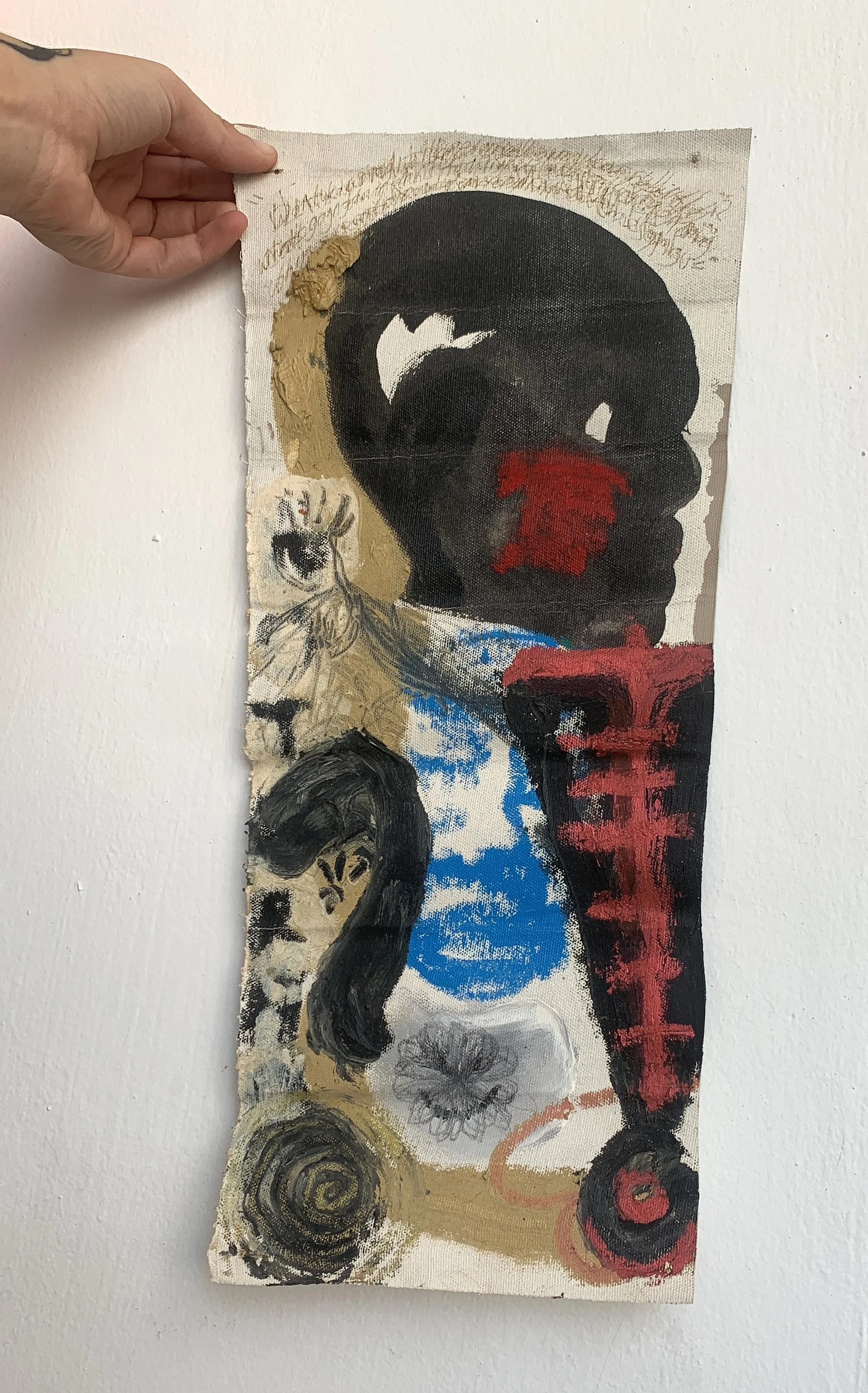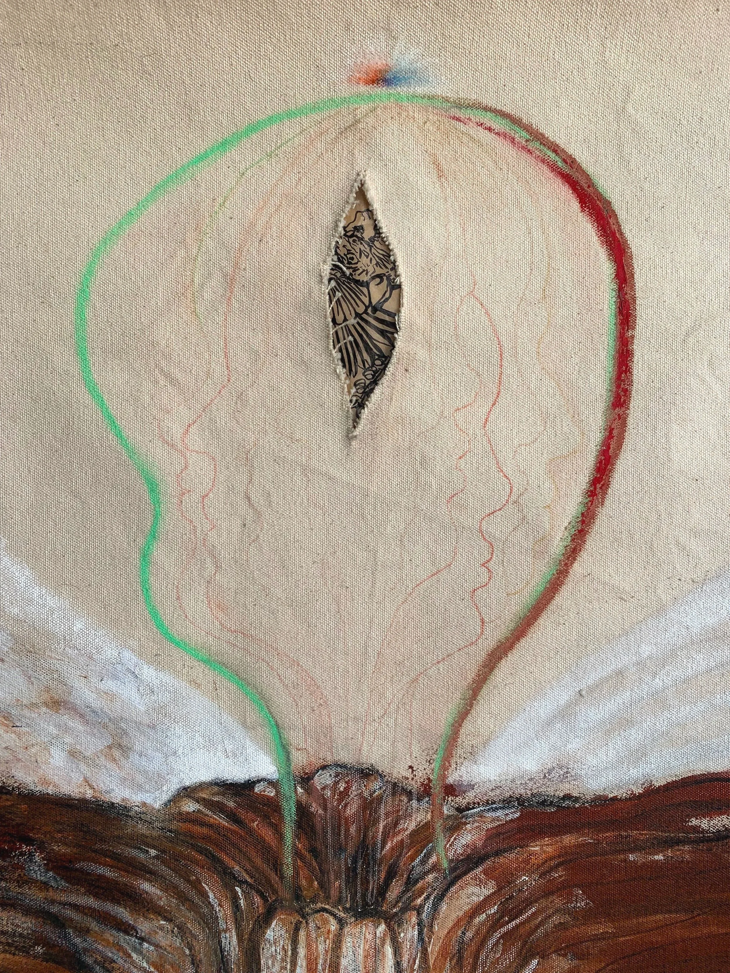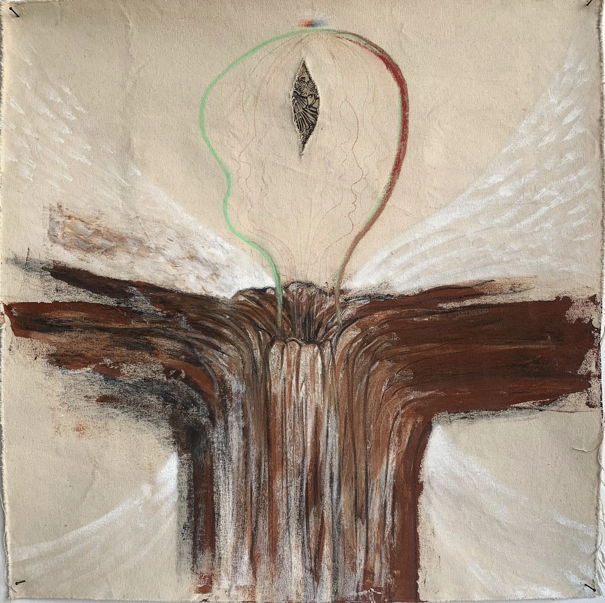 Mixed media on natural canvas with cutout