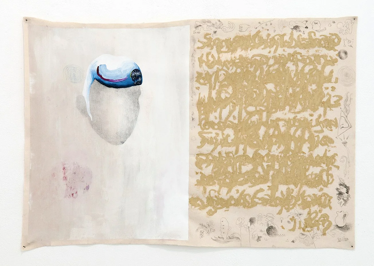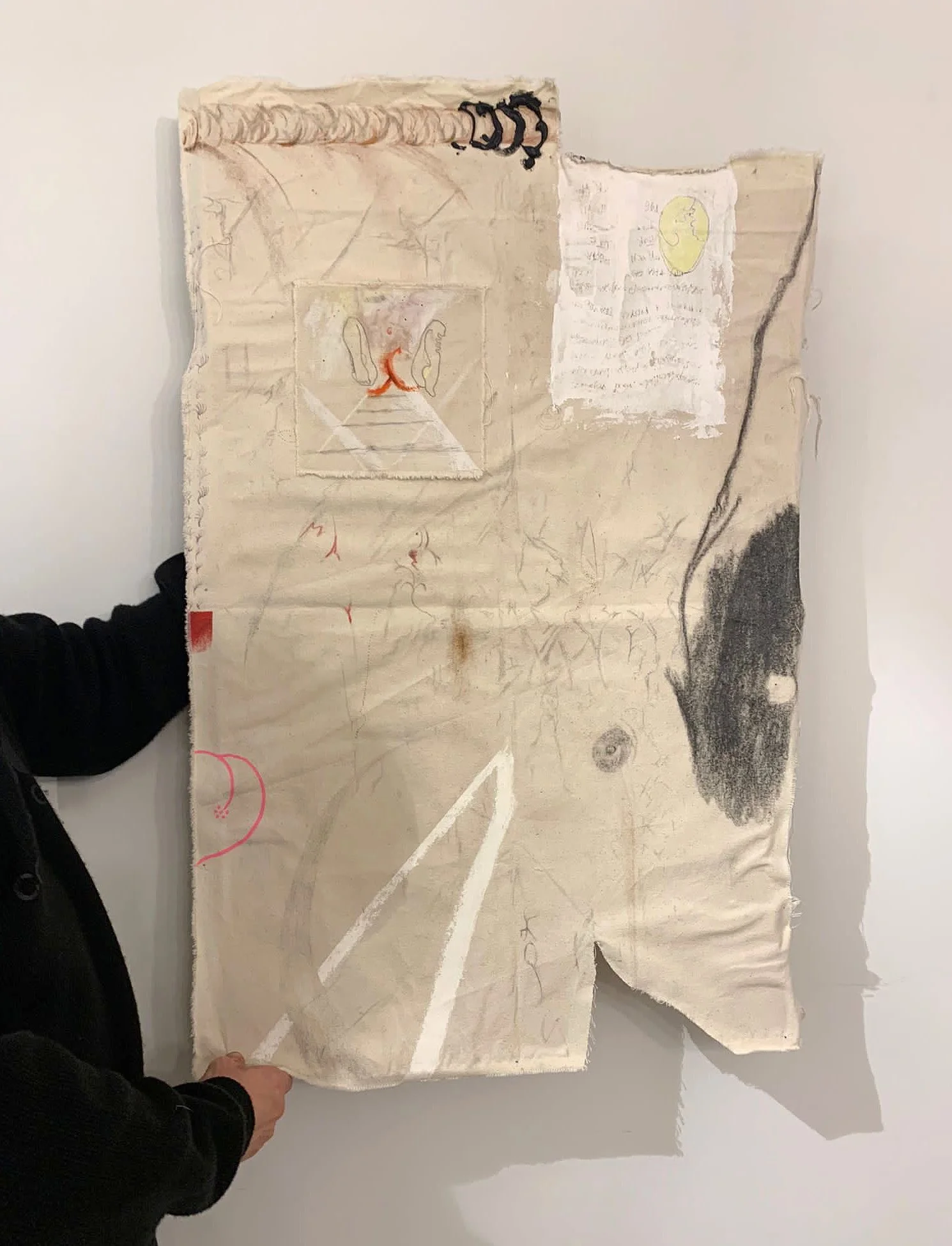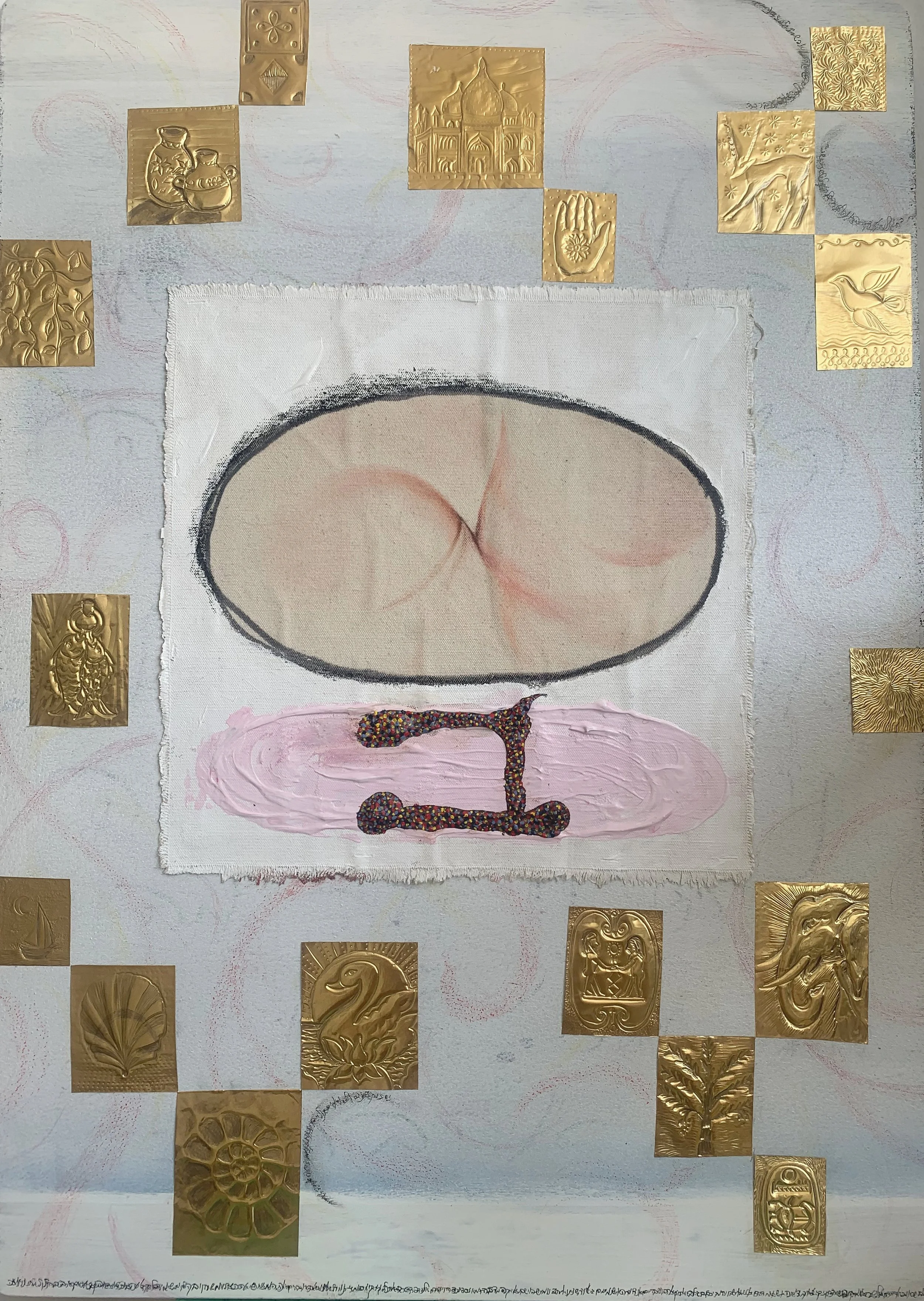 Mixed media on natural canvas with cutout